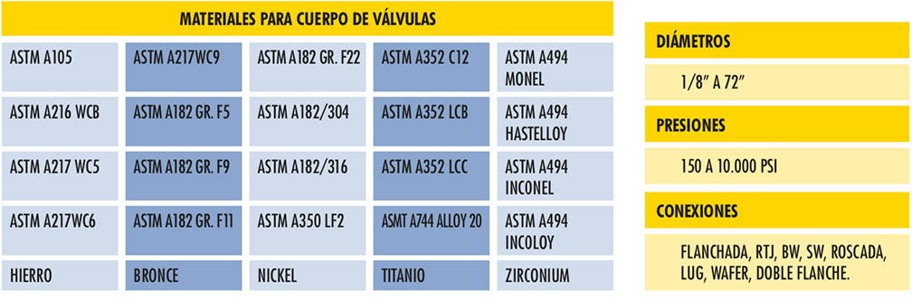 • Materiales del cuerpo: acero al carbón, acero inoxidable, aleaciones especiales